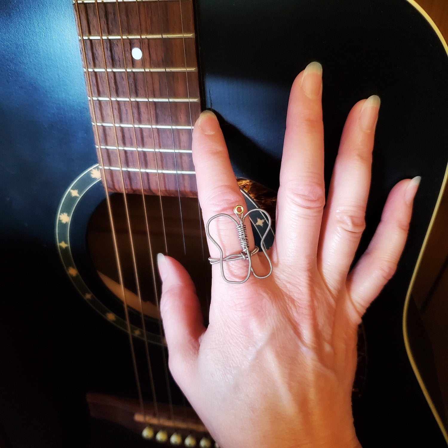 • hand resting against a black guitar wearing a butterfly shaped guitar string ring